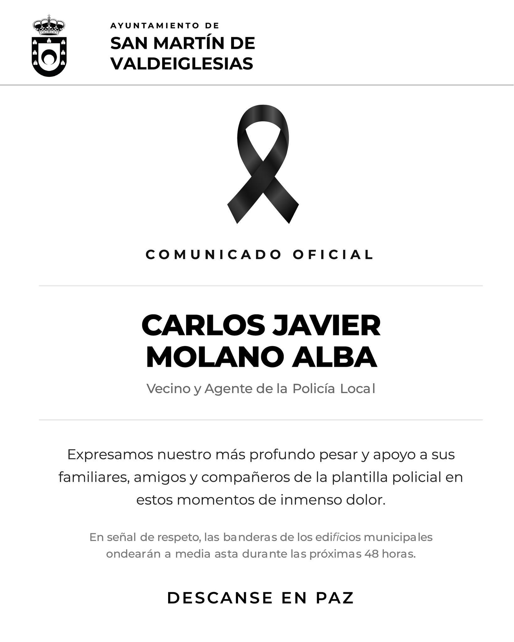 febrero 24, 2026 febrero 24, 2026Categorías GeneralEl Ayuntamiento de San Martin de Valdeiglesias lamenta profundamente el fallecimiento del Policia Municipal Carlos Javier Molano Alba