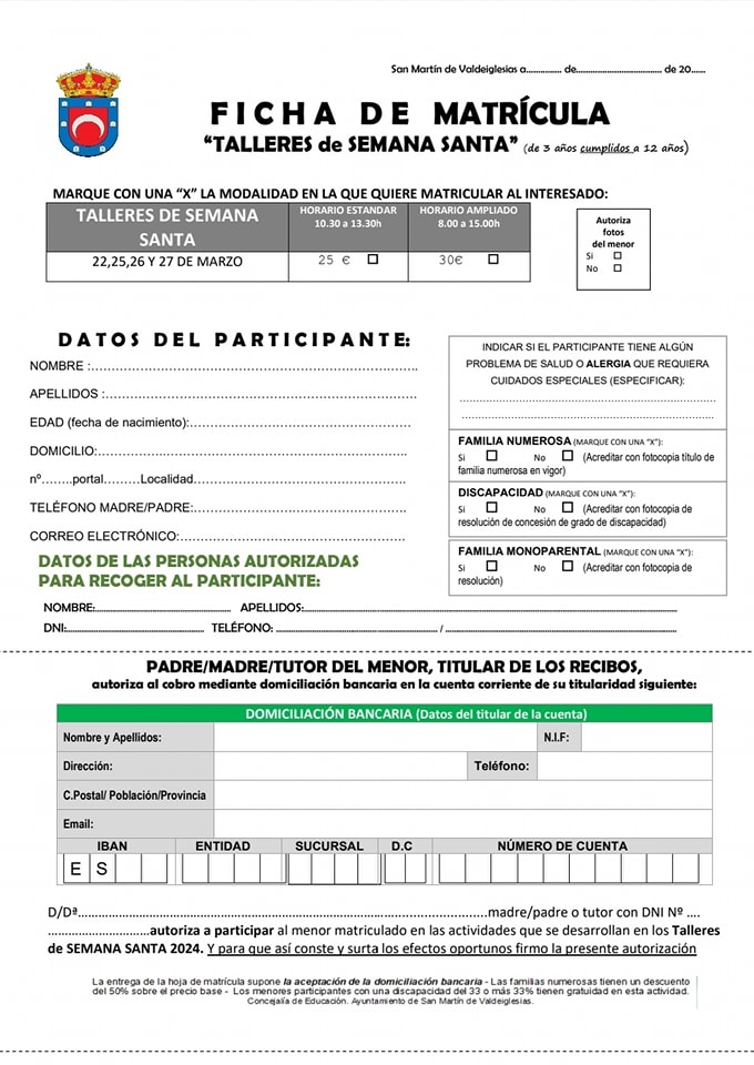 Días de los talleres: 22, 25, 26 y 27 de marzo 2024. El 1 de abril de 2024 es fiesta local en el municipio.
