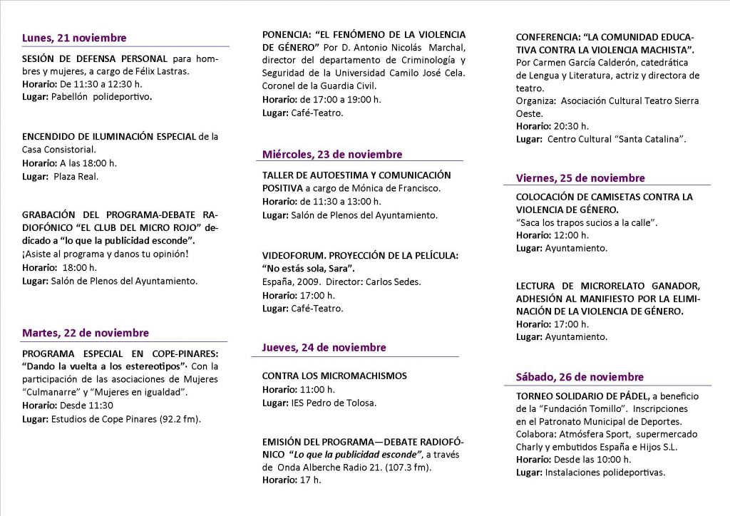 Además de conferencias y lectura del manifiesto, las actividades hacen hincapié en la creación de debates y actividades de reflexión, sobre todo entre los jóvenes. Para ello el Ayuntamiento ha organizado un concurso de microrelatos en el IES Pedro de Tolosa y dos programas radiofónicos en las emisoras de ámbito local.