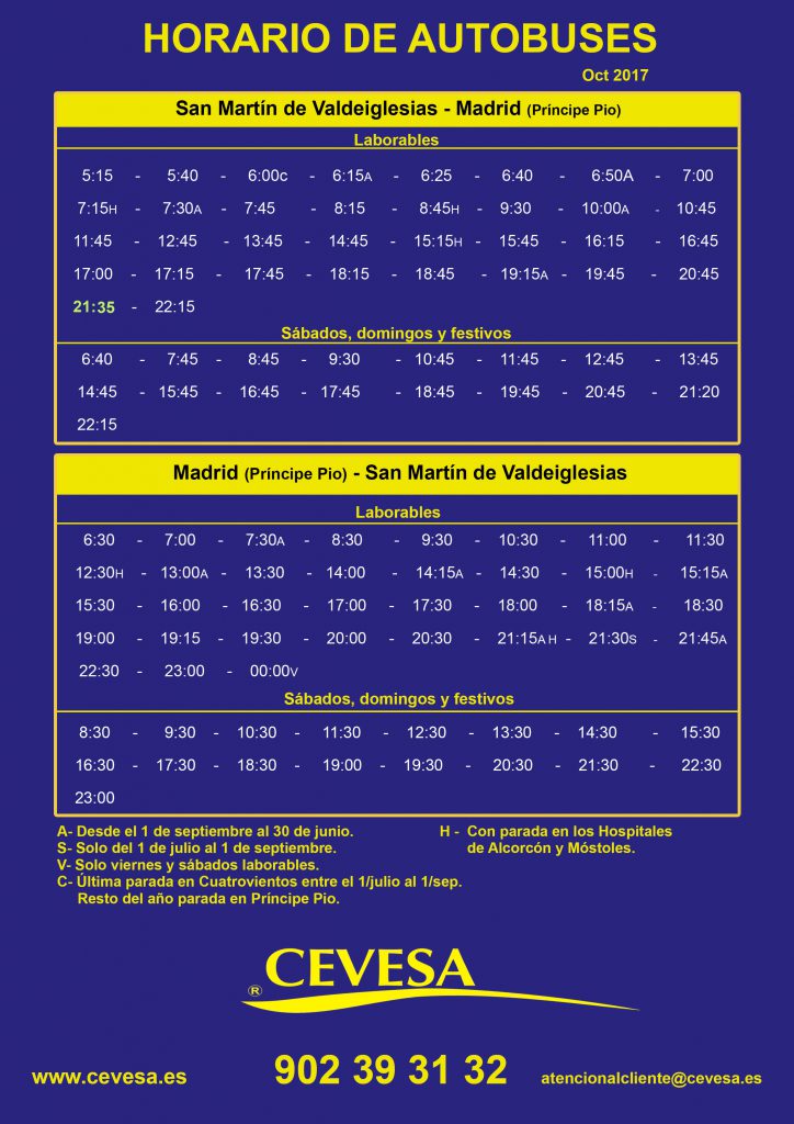 En el sentido Madrid – San Martín de Valdeiglesias hay un autocar a las 19:15 h. y otro a las 23 h. que permitirá que los vecinos que trabajen en Madrid y salgan de trabajar a las 22 h. puedan regresar a casa en transporte público.