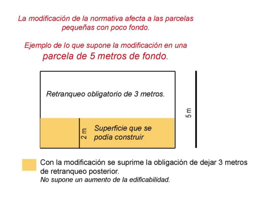 La modificación suprime el retranqueo posterior en las plantas de piso en aquellas parcelas cuyo fondo sea inferior o igual a 12 metros, algo obligatorio según la anterior norma y que hacía que las parcelas pequeñas, con poco fondo no se pudiesen construir. La eliminación del retranqueo posterior no va a suponer un aumento de la edificabilidad total.