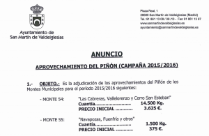 diciembre 11, 2015La adjudicación de los aprovechamientos del Piñón de los Montes Municipales para la campaña 2015/2016 ya ha sido anunciada. Podéis encontrar la información a continuación.