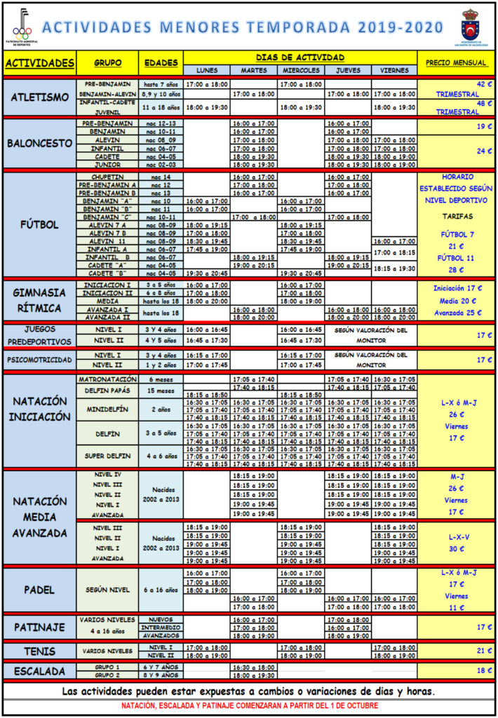 - Horario de las instalaciones polideportivas: de lunes a viernes de 9 a 14 h. y de 16 a 22 h. Sábados de 10 a 14 h. y de 17 a 21 h. Domingos y festivos cerrado.