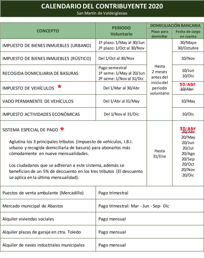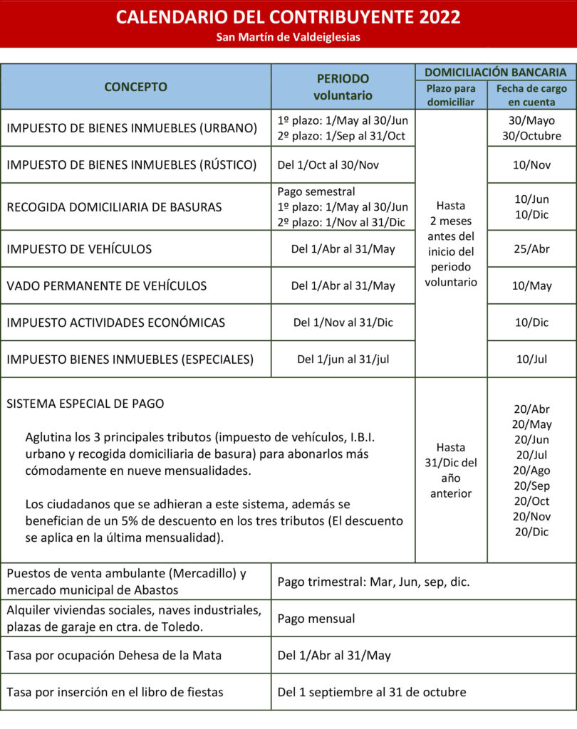 Pagar más cómodamente los principales tributos y, además, beneficiarse de un descuento del 5% en cada impuesto o tasa. El descuento se aplica en la última mensualidad (diciembre) una vez se haya comprobado el correcto abono de los recibos anteriores. Este sistema solo admite el pago mediante domiciliación bancaria. Los recibos se cargan en cuenta en las siguientes fechas: 20 de abril- 20 de mayo – 20 de junio – 20 de julio – 20 de agosto – 20 de septiembre – 20 de octubre – 20 de diciembre. - ¿Qué requisitos hay que cumplir?