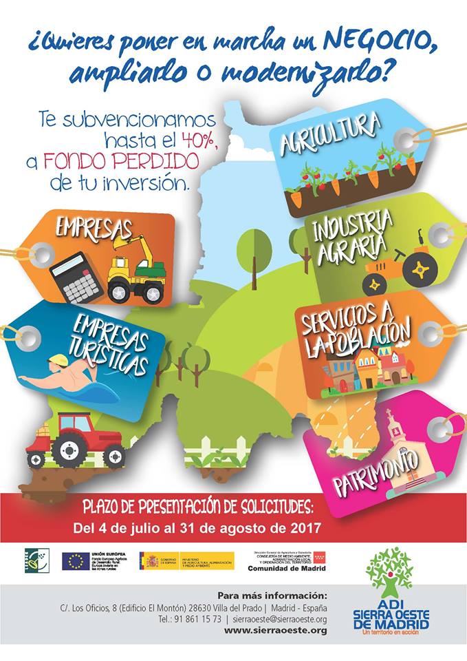 julio 12, 2017Las personas que estén pensando en crear una empresa o bien ampliar o modernizar un negocio ya existente, tienen una oportunidad de conseguir un apoyo económico que les ayude a hacer realidad su proyecto. ADI Sierra Oeste (heredero del Consorcio Sierrra Oeste) ha abierto el plazo de solicitudes para solicitar ayudas que impulsen el desarrollo de la comarca.