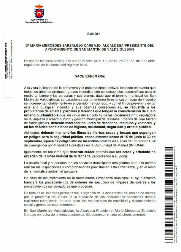 a la vista de la primavera y la próxima época estival, teniendo en cuenta que todos los años se producen graves incendios con consecuencias catastróficas para el medio ambiente y las personas y sus bienes, dado que el término municipal de San Martín de Valdeiglesias se caracteriza por un entorno forestal cuyo riesgo de incendio se incrementa notablemente en el periodo mencionado, y con el fin de prevenir y evitar este año cualquier incendio y sus pésimas consecuencias, se recuerda a los propietarios de solares, parcelas y terrenos que tengan la consideración de suelo urbano o urbanizable que, en virtud del artículo 12 de las Ordenanza nº3 reguladora de la limpieza y ornato público y gestión municipal de residuos urbanos de San Martín de Valdeiglesias, deberán mantenerlos libres de desechos, residuos y vectores, y en las debidas condiciones de higiene, salubridad, seguridad y ornato público.