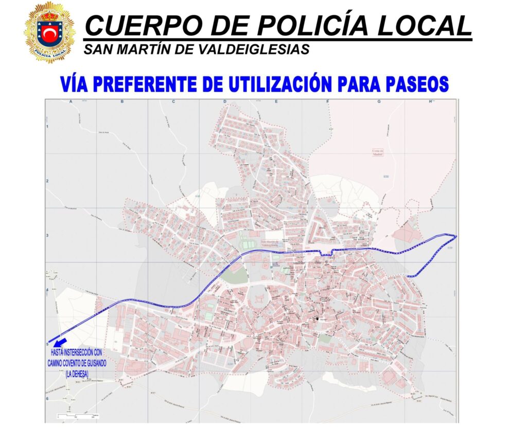 g) El Excmo. Ayuntamiento de San Martín de Valdeiglesias, en uso de la facultad que dispone el apartado 5 del artículo 3 de la Orden SND/380/2020, establece como VÍA PREFERENTE DE UTILIZACIÓN PARA PASEOS la Avenida del Ferrocarril (según itinerario que difundirá el Cuerpo de Policía Local de San Martín de Valdeiglesias).
