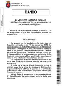 agosto 31, 2022El Ayuntamiento de San Martín de Valdeiglesias ha publicado un Bando para informar a los hosteleros de la posibilidad de ampliación del horario de apertura durante las Fiestas Patronales. Las solicitudes tienen que presentarse en el registro del Ayuntamiento, antes del 28 de agosto de 2022.