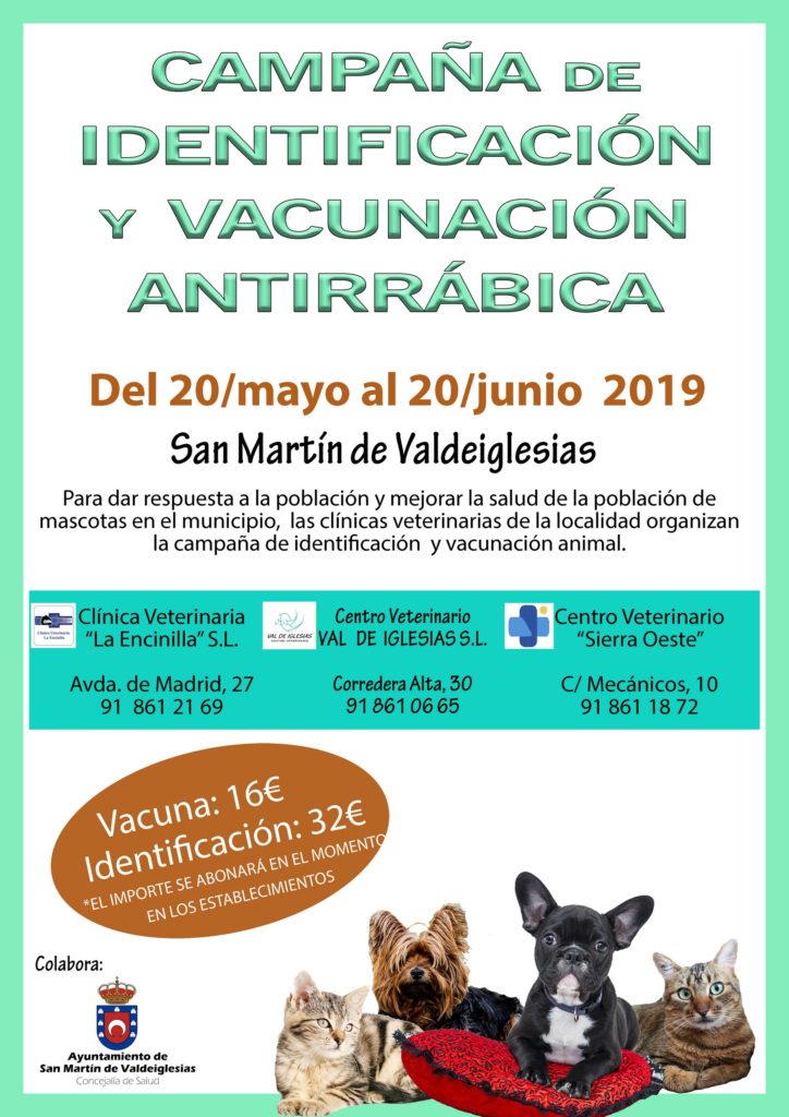 mayo 15, 2019El 20 de mayo comienza una campaña especial de vacunación antirrábica e identificación realizada por las tres clínicas veterinarias de San Martín de Valdeiglesias con el objetivo de facilitar el cumplimiento de la normativa y mejorar la salud de la población de mascotas.