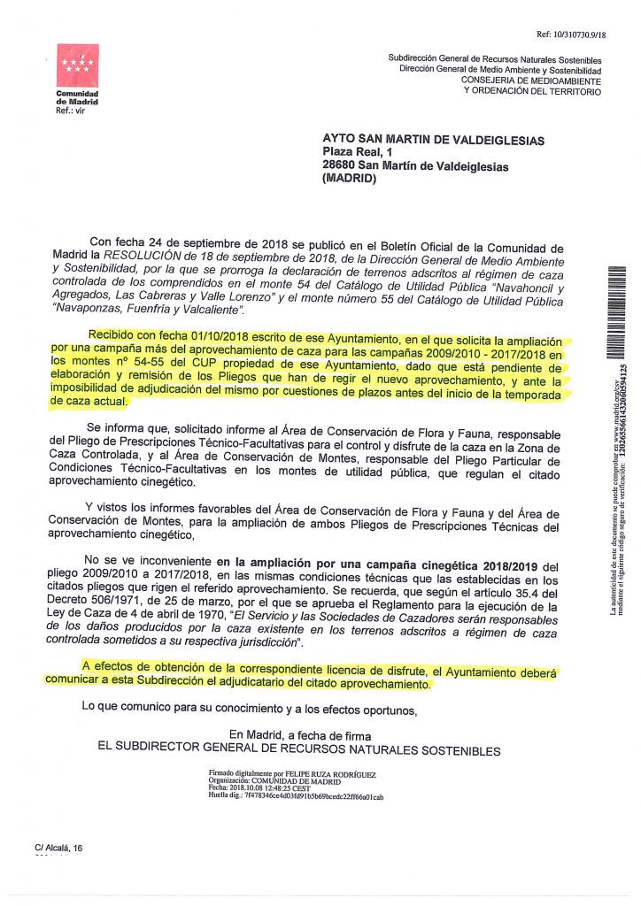 octubre 11, 2018Los aficionados a la caza podrán comenzar la temporada este fin de semana como es habitual. Hoy se ha recibido en el Ayuntamiento la resolución de la Comunidad de Madrid que amplía las condiciones para el coto del monte público durante un año más. O lo que es lo mismo, el permiso para que la sociedad de cazadores pueda realizar su actividad en el monte público, durante toda la temporada, con las mismas condiciones que el año anterior.