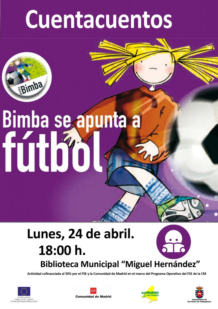 abril 20, 2017La Biblioteca Municipal «Miguel Hernández» celebra el día del libro con un cuentacuentos, dirigido a niños y niñas a partir de 5 años. Una actividad con la que pretendemos acercar a los más pequeños a la lectura y además, reflexionar sobre diferentes roles de género a través de «Bimba» una niña que descubre en el fútbol su afición favorita.