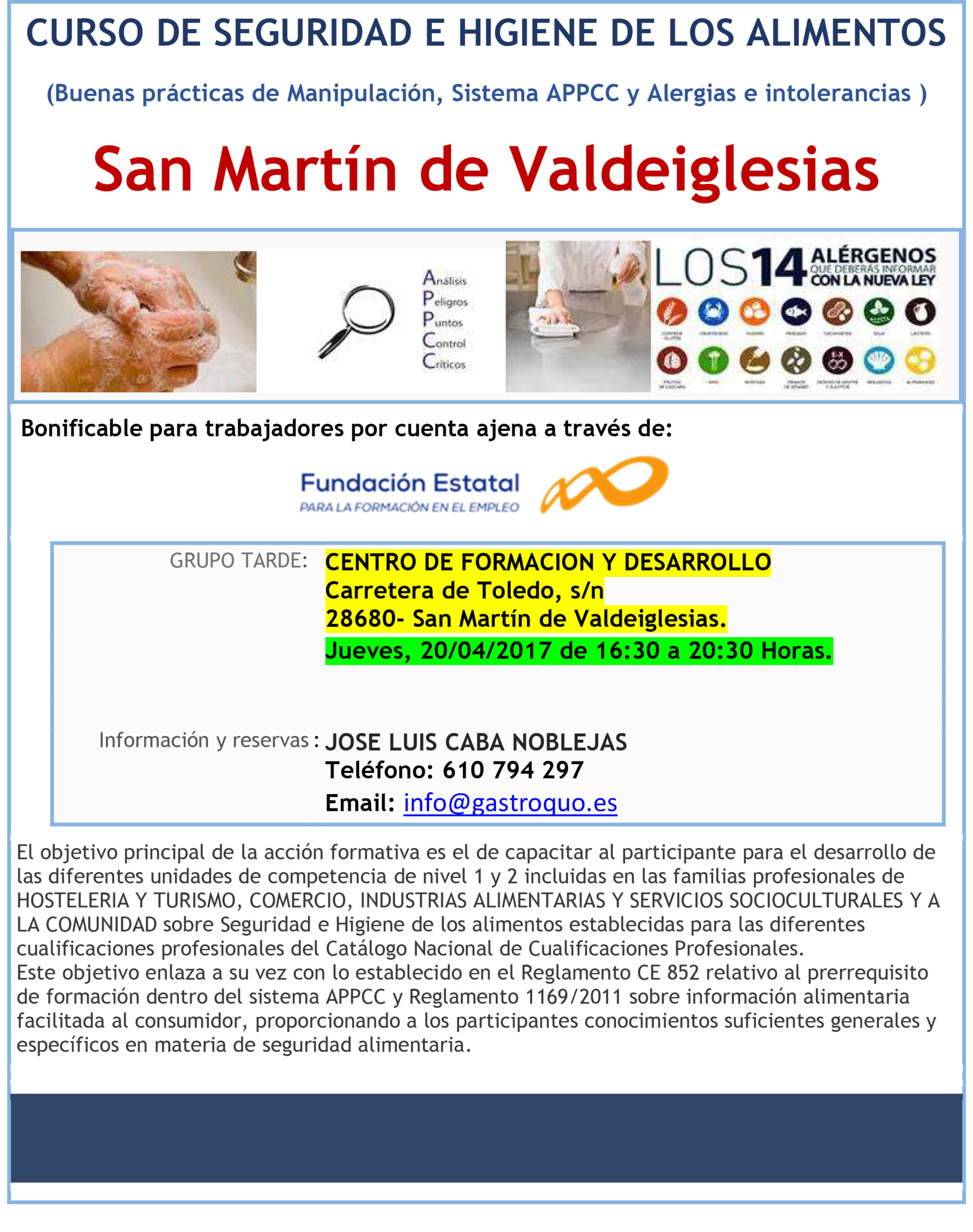 abril 20, 2017El centro de Formación y Desarrollo va a albergar un curso de seguridad e higiene de los alimentos, ( certificable para obtener el certificado de manipulador), el jueves 20 de abril en horario de tarde.