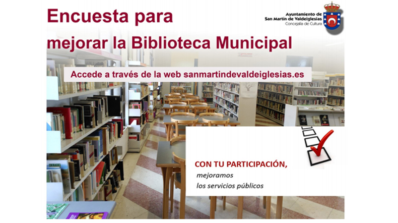 La concejalía de Cultura quiere potenciar la Biblioteca Pública Municipal, “mejorar este servicio público fundamental, contando con las opiniones de los usuarios y los vecinos” afirma la concejala de Cultura, Mónica Martín. “Por este motivo, vamos a publicar una encuesta online, para recoger las demandas de los usuarios, conocer cuál es su grado de satisfacción de los diferentes servicios, saber qué aspectos concretos quieren mejorar”.