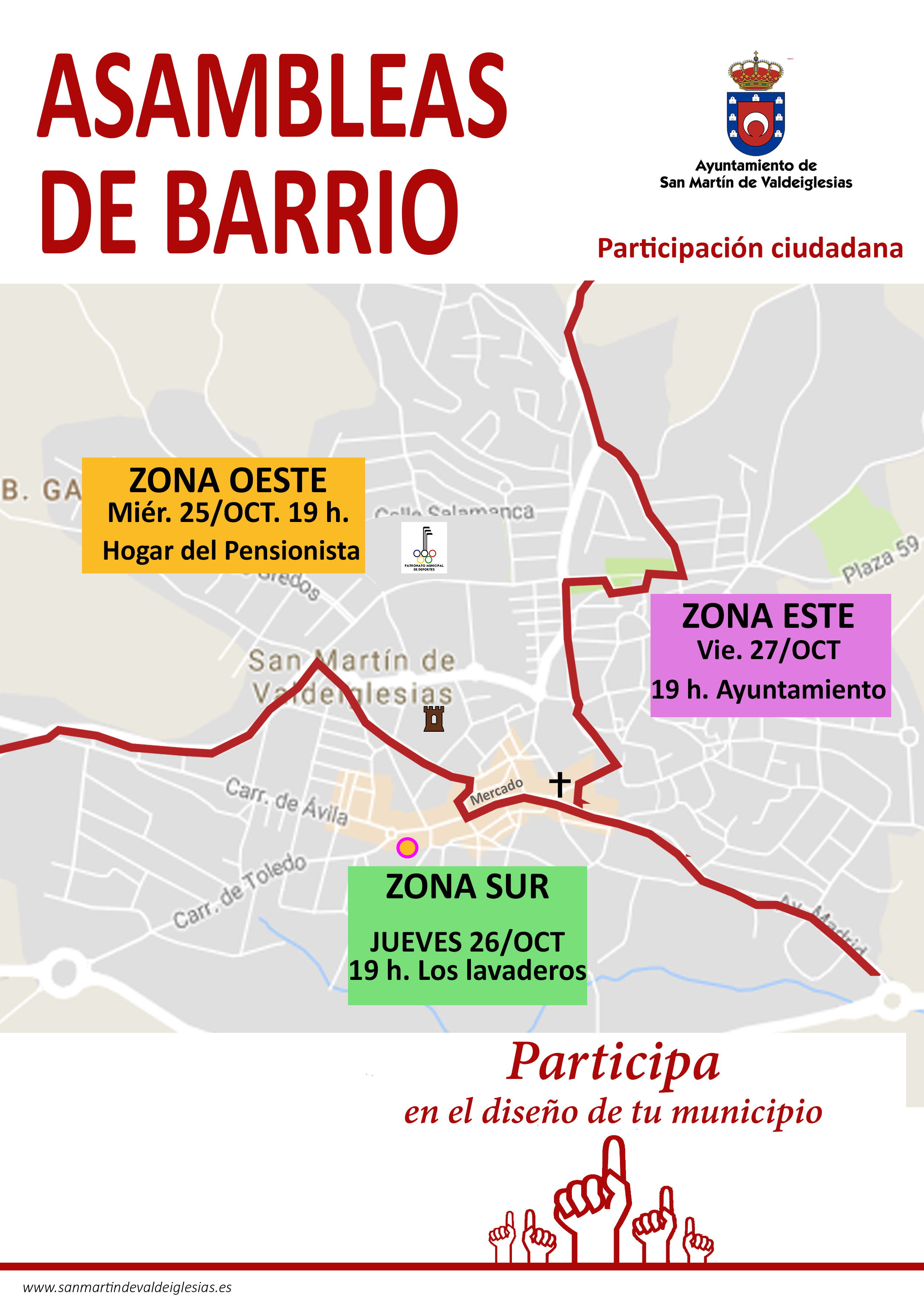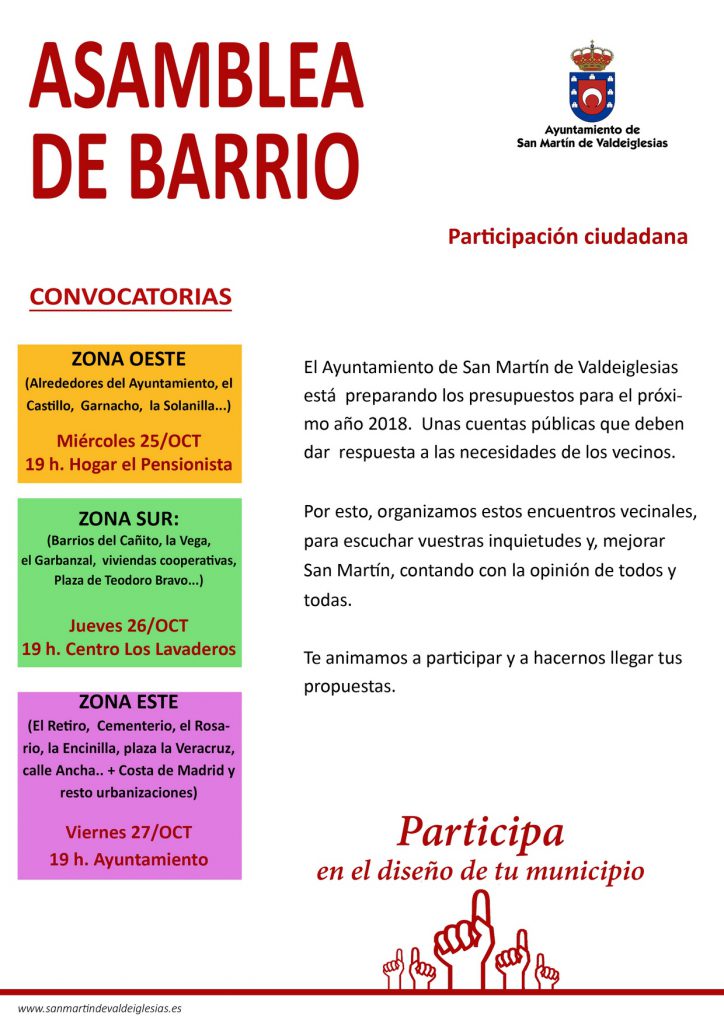 octubre 25, 2017El Gobierno municipal de San Martín de Valdeiglesias celebrará durante esta semana 3 encuentros vecinales para recoger propuestas y responder a las preguntas de los vecinos. Es una nueva convocatoria de las Asambleas de barrio que se desarrollarán durante los días 25, 26 y 27 de octubre en los diferentes barrios, «De esta forma nos acercamos aún más a los ciudadanos y facilitamos la participación» asegura la concejala de Participación Ciudadana, Alexandra de Luis.