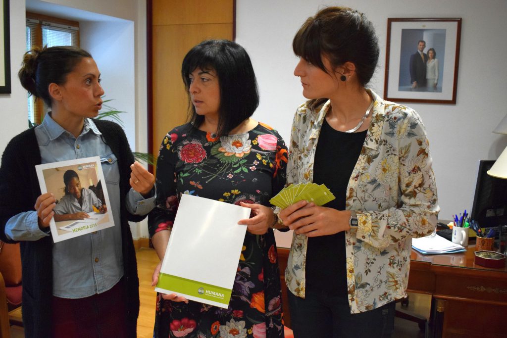 La alcaldesa, María Luz Lastras, junto con la concejala de Bienestar Social, Alexandra de Luis, han recibido esta mañana los 15 bonos de manos de Beatriz Arribas, promotora de la Fundación Humana, una ONG que se encarga de reutilizar los contenedores de textil usado que hay en nuestra localidad.