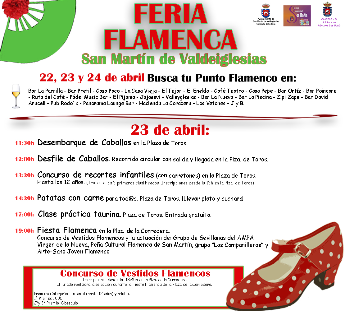 abril 22, 2016- Este fin de semana San Martín de Valdeiglesias, disfrutará de una Feria Flamenca en la que habrá actividades taurinas, desfile de caballos, concurso de vestidos y gastronomía típica andaluza en los más de 20 establecimientos que se han sumado a esta iniciativa del Ayuntamiento.
