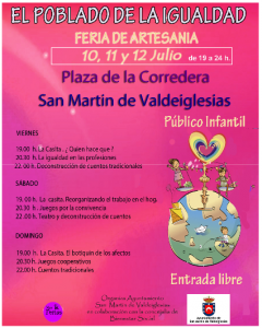El poblado de la igualdad es una actividad nueva en el verano de San Martín de Valdeiglesias. Una actividad lúdica dirigida a fomentar la coeducación en las familias, que se desarrollará en la Plaza de la Corredera, desde el viernes 10 hasta el domingo 12 de julio.