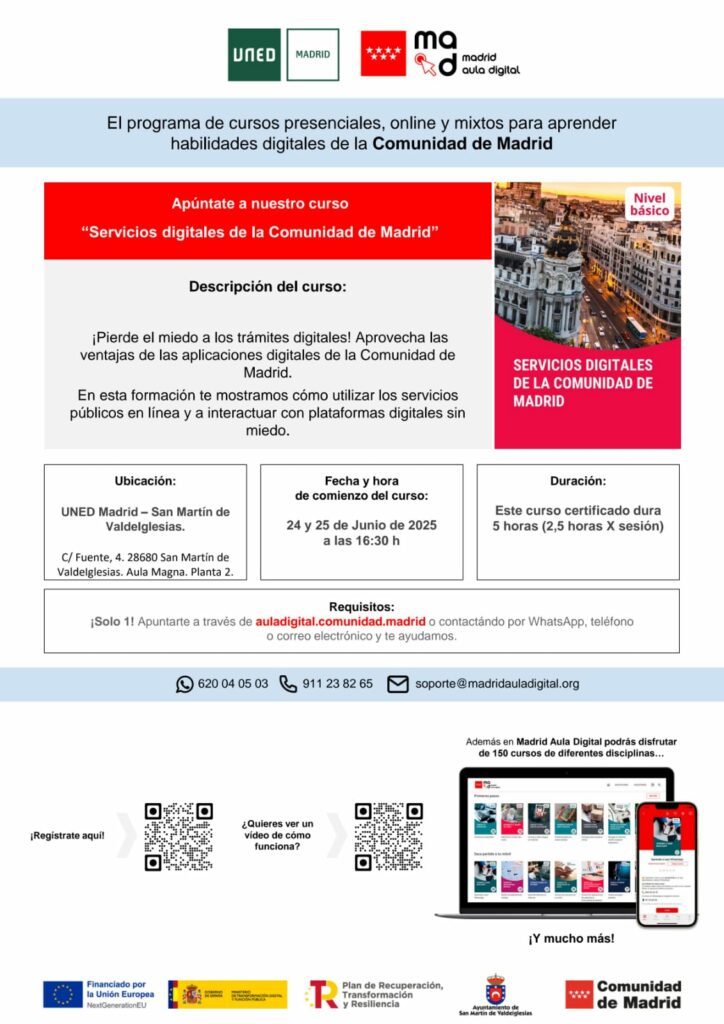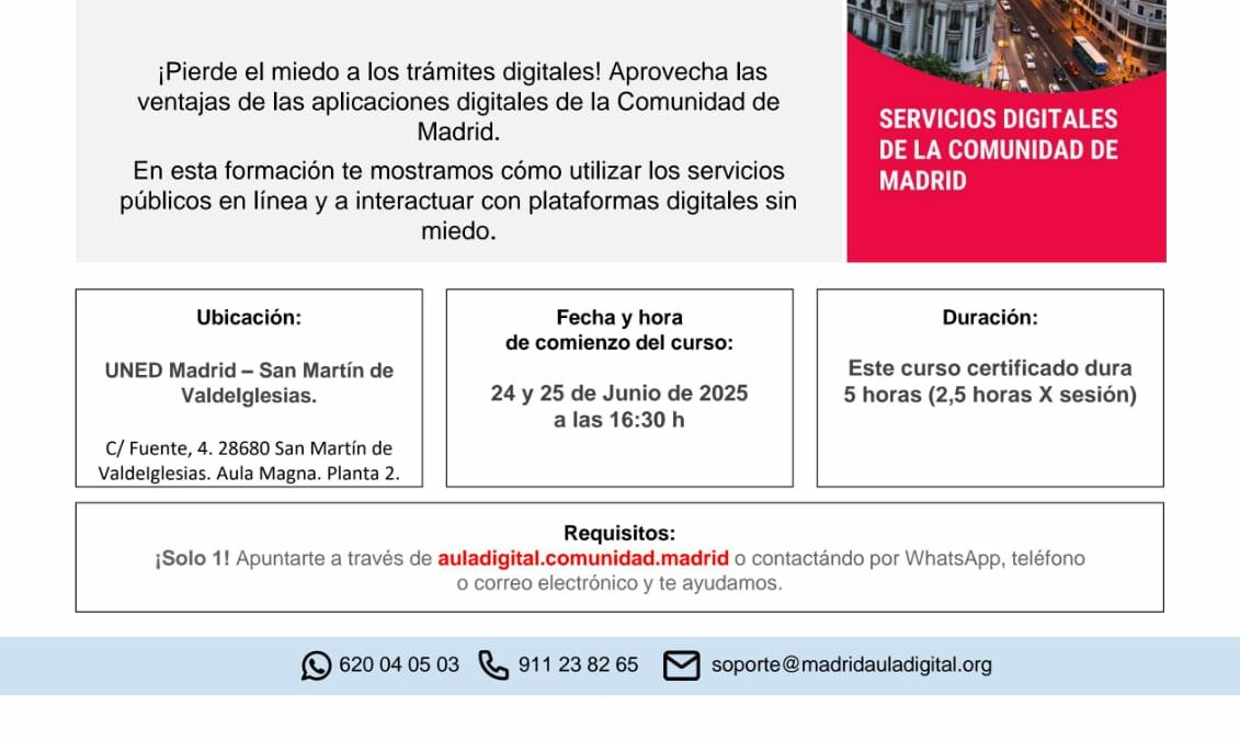 El Ayuntamiento de San Martín de Valdeiglesias invita a todos los vecinos a participar en un curso gratuito y certificado destinado a facilitar el manejo de los servicios digitales de la Comunidad de Madrid. La iniciativa, que se realizará los días 24 y 25 de junio de 2025, busca ayudar a los ciudadanos a perder el miedo y mejorar sus competencias en trámites digitales.