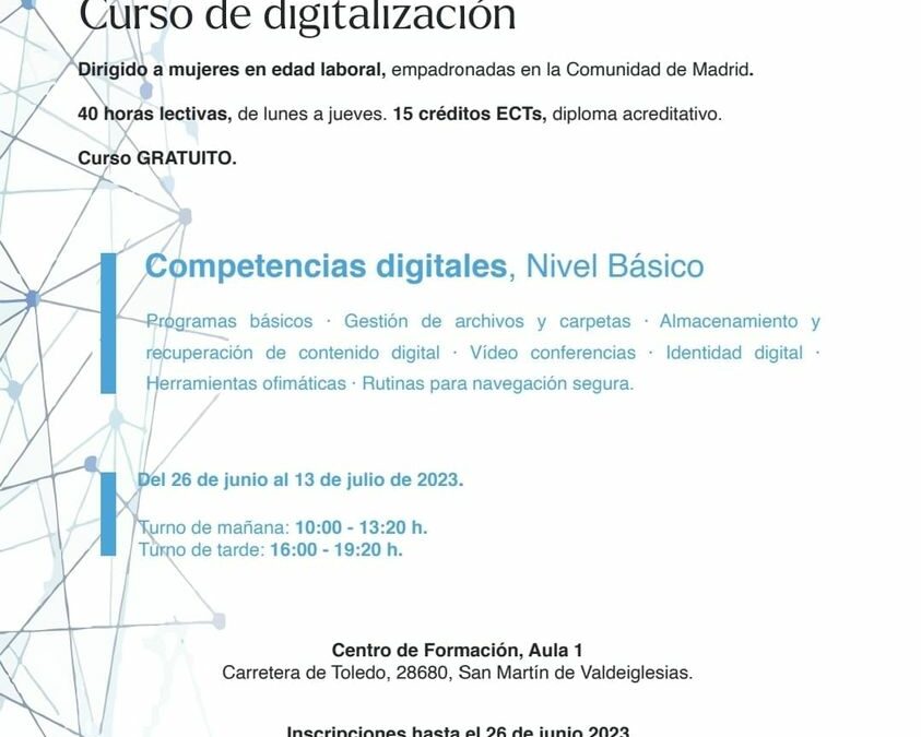 junio 15, 2023El Centro de Formación y Desarrollo albergará dos nuevos cursos para fomentar la formación digital de las mujeres, impartido por AFAMER Comunidad de Madrid y financiado por los fondos europeos NextGeneration.