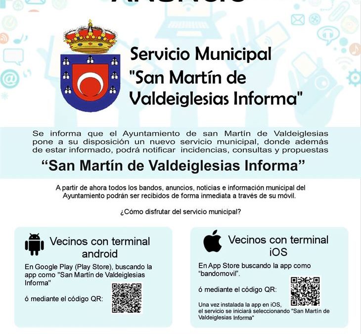 febrero 13, 2020El Ayuntamiento de San Martín de Valdeiglesias ha puesto en marcha una nueva aplicación adaptada a los dispositivos móviles para mejorar la comunicación con los ciudadanos, que recibirán notificaciones emergentes e instantáneas sobre actividades culturales, avisos o cualquier información que sea de utilidad.