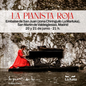 Concierto de música en el que la pianista está en el agua, sobre una balsa. El público se sitúa en la orilla.