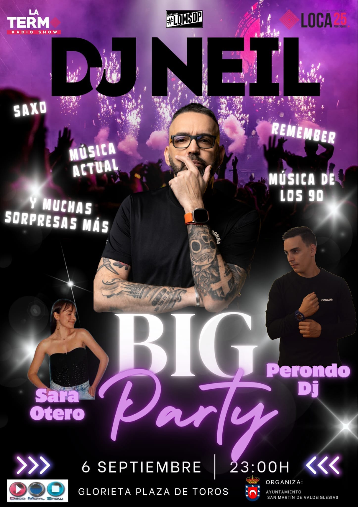 23:00 h. – 4:30 h. BIG PARTY con DJ NEIL (uno de los Dj más populares de España) + los DJ locales Sara Otero y Perondo. Lugar: Glorieta junto a la Plaza de Toros.