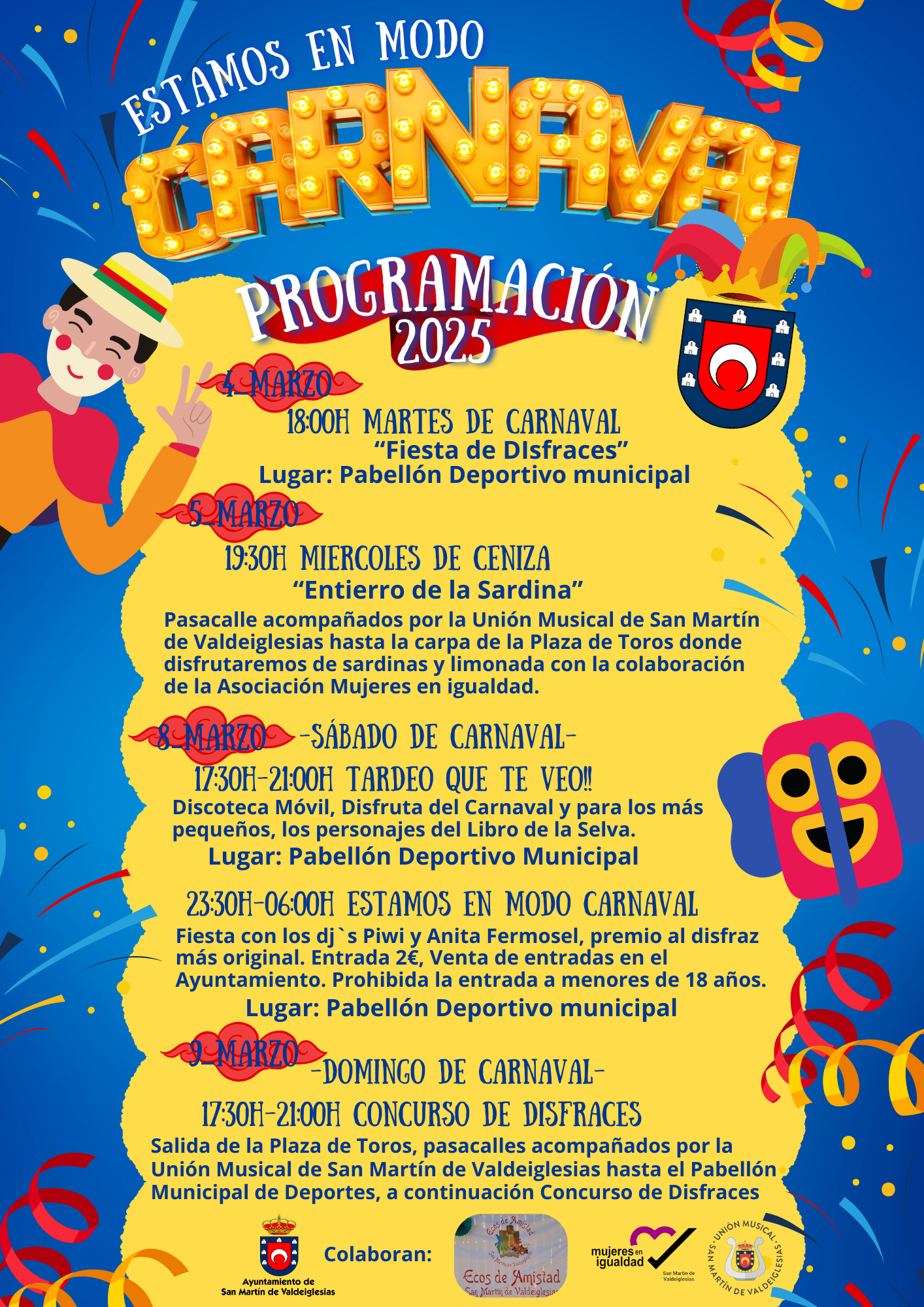 Tradicional domingo de Piñata. 17:30 h. Salida del pasacalles desde la Plaza de Toros, acompañados de la Unión Musical de San Martín de Valdeiglesias, hasta el pabellón municipal de deportes, a continuación concurso de disfraces hasta las 21 h.