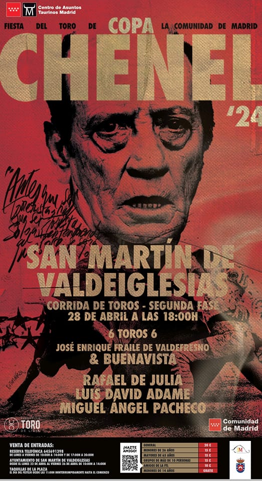 Segundo festejo de Segunda Fase del ciclo de Novilladas de la Comunidad de Madrid, «Copa Chenel», con toros de Buenavista y José Enrique Fraile de Valdefresno para los matadores Rafael de Julia, Luis David Adame y Miguel Ángel Pacheco.