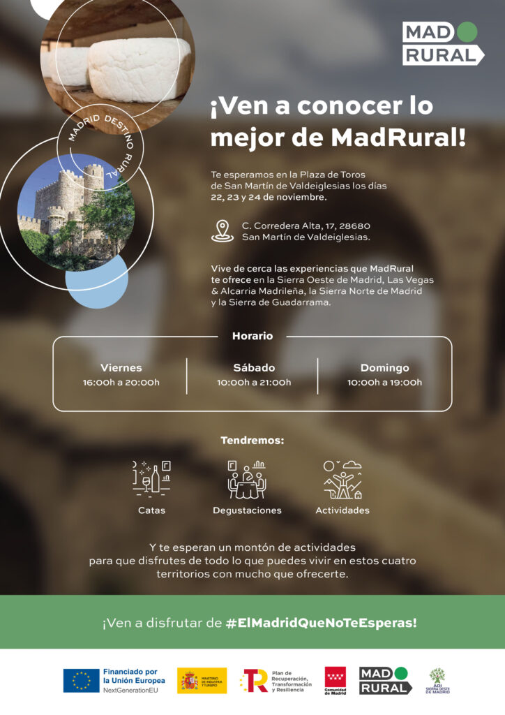 MadRural es un destino de cuatro territorios rurales de la Comunidad de Madrid (Sierra Oeste, Sierra Norte, Sierra de Guadarrama y Las Vegas & Alcarria), que ofrecen multitud de experiencias para disfruta de un entorno y patrimonio muy singular. En esta feria los visitantes podrán realizar actividades, talleres, degustaciones y catas de los mejores productos locales del territorio. Una cita para descubrir «El Madrid que no te esperas».