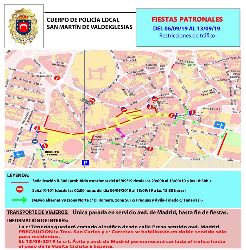 Para que las diferentes actividades se puedan realizar en condiciones de seguridad habrá restricciones tanto en el aparcamiento como en la circulación de vehículos. La principal afecta a la travesía que permanecerá cerrada al tráfico desde las 2 de mañana del 6 de septiembre, hasta las 18:30 h. del 13 de septiembre. Durante todo este tiempo la única parada de autobús habilitada será la situada en la avenida de Madrid.