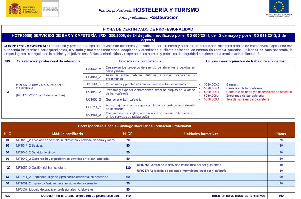 Ficha del certificado de profesionalidad «Servicios de bar y cafetería» que se va a impartir en San Martín de Valdeiglesias.