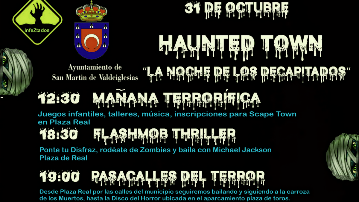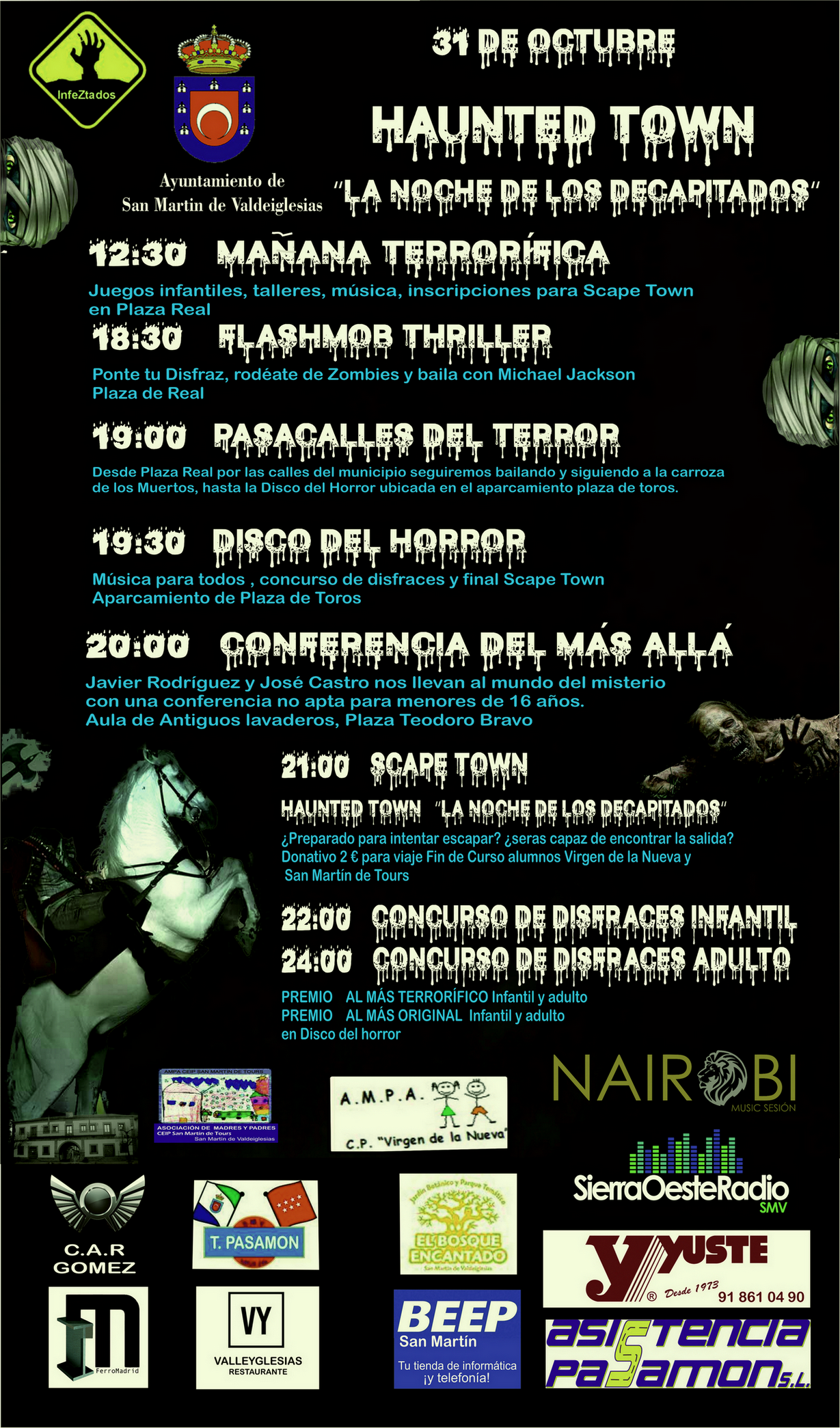 octubre 30, 2019El Ayuntamiento de San Martín de Valdeiglesias, en colaboración con diferentes colectivos, asociaciones y empresas, organiza una propuesta de ocio diferente para el próximo 31 de noviembre: Haunted Town, la noche de los decapitados.