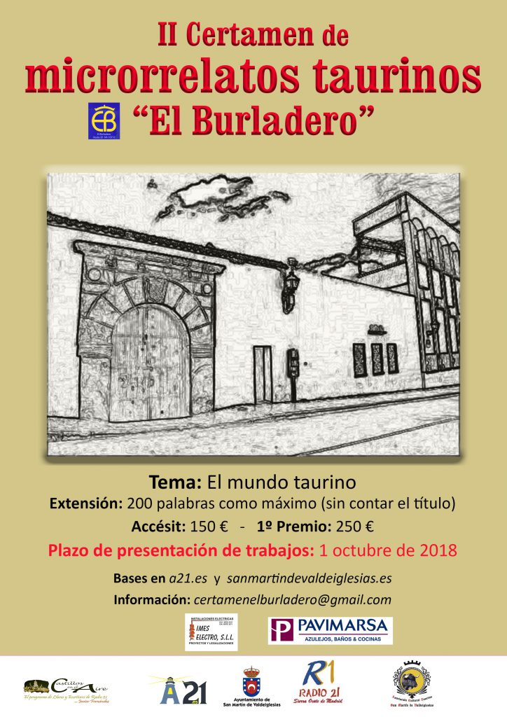 agosto 1, 2018El programa de Radio 21 “El Burladero”, en colaboración con el Ayuntamiento de San Martín de Valdeiglesias y el patrocinio de las empresas Pavimarsa e Imes Electro, convocan el II Certamen Nacional de Microrrelatos Taurinos.