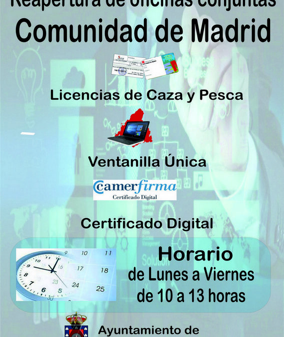 junio 24, 2020El Ayuntamiento de San Martín de Valdeiglesias reanuda otros trámites presenciales, que se prestan a través de la Oficina de Información Conjunta de la Comunidad de Madrid (Ventanilla Única) y que va a facilitar que los ciudadanos del municipio puedan obtener el certificado digital y la licencia de caza o pesca. El resto de trámites que se realizaban desde esta ventanilla, como el registro de documentos a cualquier administración pública, se irán incorporando de forma progresiva.