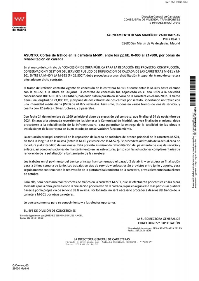 abril 8, 2024Informamos a los ciudadanos que con motivo de las obras de acondicionamiento del pavimento en la M-501, en el tramo comprendido entre la M40 y el cruce con la M522 (cruce de Quijorna), esta carretera sufrirá cortes de carril en ambos sentidos.