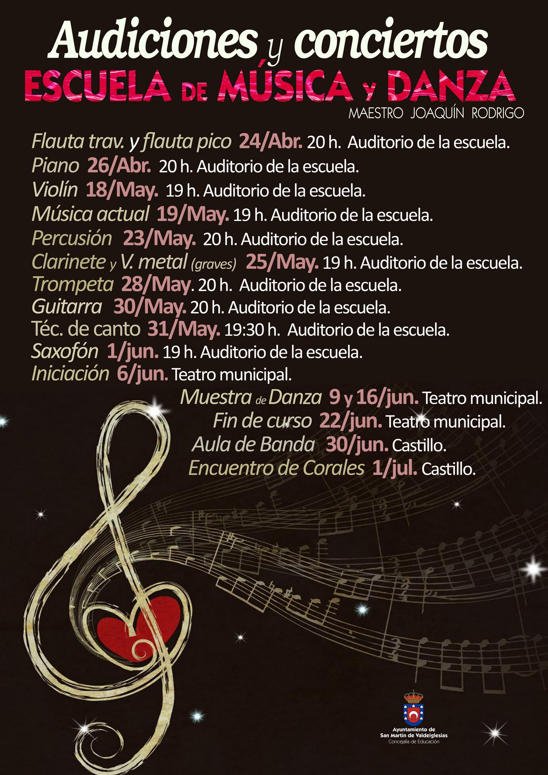 Por un lado están las audiciones pedagógicas, pequeños conciertos por instrumentos que sirven para motivar a los alumnos, a perder el miedo a tocar en público… que se desarrollarán en el auditorio de la escuela, excepto la del aula de iniciación (de 3 a 7 años), que se realiza en el Teatro Municipal por la cantidad de participantes y espectadores.