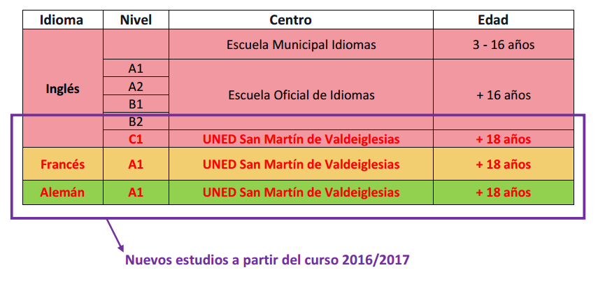 San Martín de Valdeiglesias aumenta los recursos educativos para sus ciudadanos y para el próximo curso escolar ofrece tres nuevos estudios de idiomas, a través de la UNED: el nivel básico de francés y alemán y el avanzado, C1, de inglés.