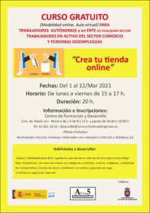 Está dirigido a autónomos, personas en ERTE de cualquier sector, y trabajadores por cuenta ajena del sector del comercio, así como a personas desempleadas (para las que hay un cupo máximo). Se desarrollará de forma online desde el lunes 1 hasta el viernes 12 de marzo, en horario de 15 a 17 h. Para ello, los alumnos tienen que tener ordenador con webcam, conexión a Internet, y el sistema operativo Windows 10 (como mínimo).