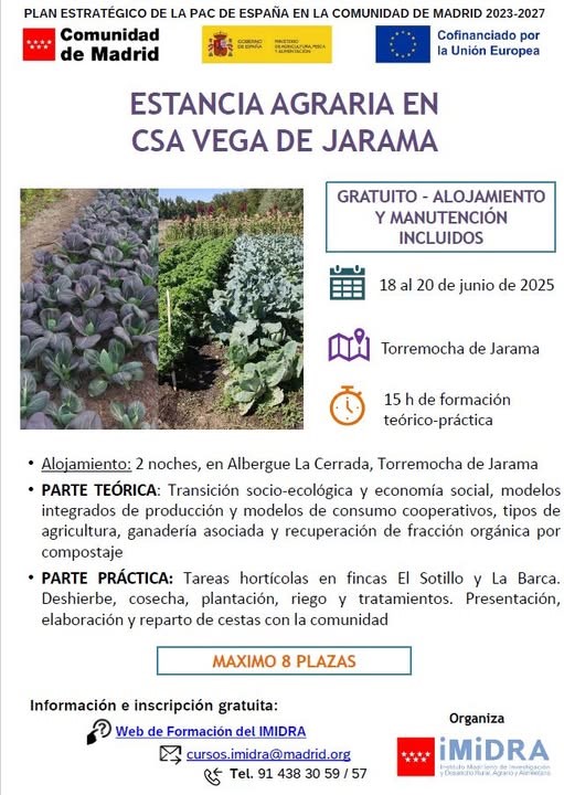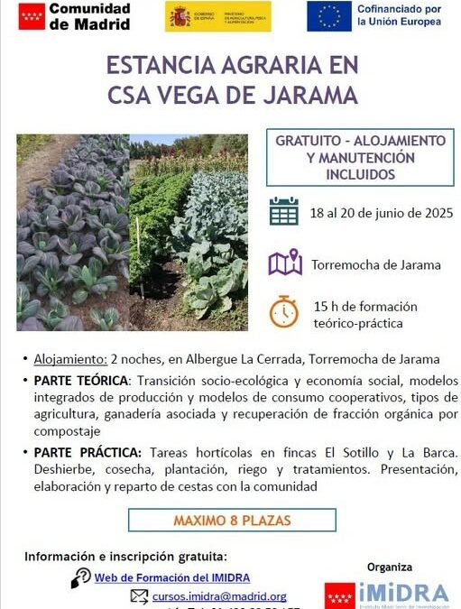 Del 18 al 20 de junio, participa en la Estancia Agraria en CSA Vega de Jarama, una experiencia formativa organizada por IMIDRA que incluye: