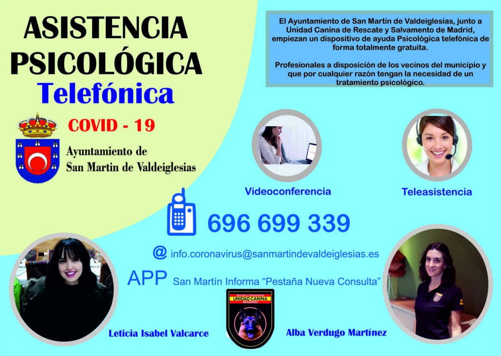 marzo 24, 2020Para paliar los efectos negativos que tienen en la salud mental y el bienestar de los ciudadanos el confinamiento al que nos vemos sometidos desde la declaración del Estado de alarma, el Ayuntamiento de San Martín de Valdeiglesias lanza una LÍNEA DE AYUDA PSICOLÓGICA GRATUITA, destinada a familias y vecinos que viven en soledad.