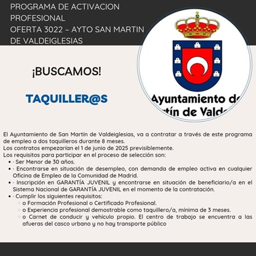 El Ayuntamiento de San Martín de Valdeiglesias, va a contratar a través de este programa de empleo a dos taquilleros durante 8 meses.