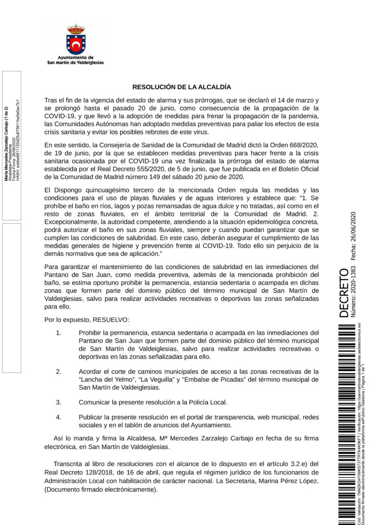 julio 6, 2020El Ayuntamiento de San Martín de Valdeiglesias ha tomado una serie de medidas extraordiarias en las zonas naturales más visitadas de la localidad, con el fin de evitar aglomeraciones de personas y como medida preventiva frente al COVID-19. En concreto, la alcaldesa ha decretado el cierre de los caminos vecinales que dan acceso a las zonas recreativas de «Picadas», «La Lancha del Yelmo» y «La Veguilla» y se prohíbe la estancia sedentaria y la acampada en el domino público del Ayuntamiento, a lo largo de todo el pantano de San Juan.