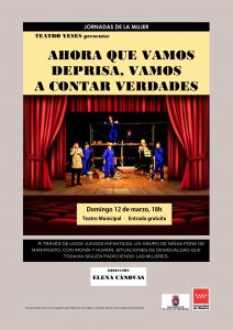 Despedimos la semana con una jornada de puertas abiertas en la piscina climatizada. Será el domingo 12 por la mañana y, por la tarde, la compañía Yeses, del Centro Penitenciario de Mujeres Alcalá 1, vuelve al Teatro municipal con la función “Ahora que vamos deprisa, vamos a contar verdades”, donde con humor e ironía las intérpretes pondrán de manifiesto las desigualdades que todavía hoy sigue padeciendo la mujer.