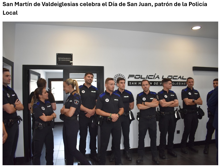 San Martín de Valdeiglesias, 24 de junio de 2025 – Hoy, 24 de junio, San Martín de Valdeiglesias rinde homenaje a su Policía Local con motivo de la festividad de San Juan, patrón del cuerpo policial. Una jornada emotiva en la que el municipio reconoce públicamente la labor diaria de los agentes que velan por la seguridad, el orden y la convivencia de todos los vecinos.