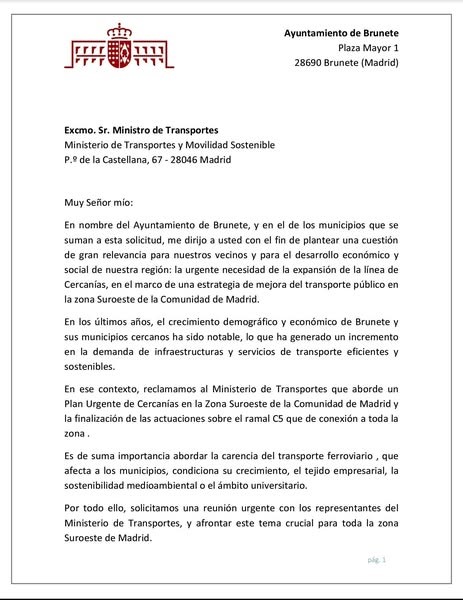 La alcaldesa de San Martín de Valdeiglesias, Aránzazu Povedano Fraguela, ha firmado, junto a otros 21 alcaldes y alcaldesas del Suroeste de la Comunidad de Madrid, una solicitud conjunta dirigida al Ministerio de Transportes y Movilidad Sostenible para reclamar la ampliación y finalización del ramal C5 de Cercanías, dentro de un Plan Urgente de Mejora del Transporte Público en la zona.