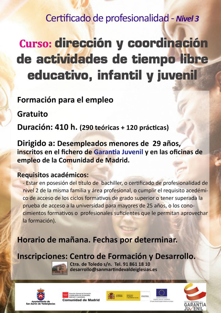 Los participantes tienen que residir en la Comunidad de Madrid y estar inscritos en una oficina de empleo de la región, en el momento de comenzar la formación. Y en el caso del curso de coordinador de tiempo libre, estar inscritos en el fichero de garantía juvenil. Las inscripciones se realizan en el centro de Formación y Desarrollo (Ctra. de Toledo s/n, Horario L-V de 8 a 15 h. tel. 91 861 18 10 – desarrollo@sanmartindevaldeiglesias.es).