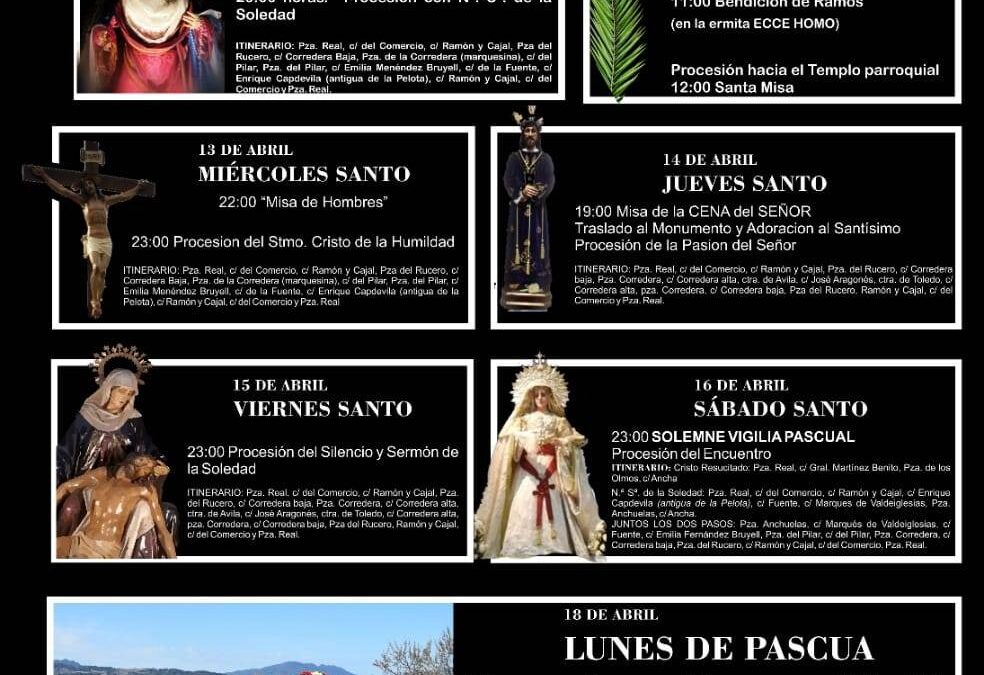 - 23:00 h. Procesión del Silencio y Sermón de la Soledad. (Itinerario: Plaza Real – C/ del Comercio – C/ Ramón y Cajal – Plaza del Rucero – C/ Corredera Baja – Plaza de la Corredera – Corredera Alta – Ctra. de Ávila – C/ José Aragonés – Ctra. de Toledo – C/ Corredera Alta – Plaza de la Corredera – C/ Corredera Baja – Plaza del Rucero – C/ Ramón y Cajal – C/ del Comercio y Plaza Real.