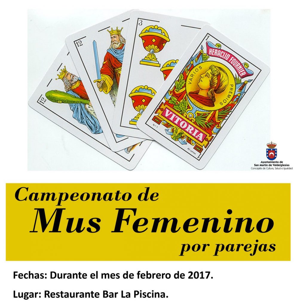 febrero 3, 2017La concejalía de Cultura, Salud e Igualdad, organiza un campeonato de Mus Femenino por parejas. Una actividad que se enmarca dentro de las Jornadas de la Mujer, que se realizarán en torno al 8 de marzo, Día Internacional de la Mujer Trabajadora.