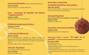 Para los aficionados a la música, además del concierto de la Escuela, también habrá actuaciones corales en la Iglesia parroquial de la mano del Coro Municipal de Boadilla del Monte “Luigi Boccherini” y Camerata Cantábile y la actuación de la Compañía Hispalírica (vals, polkas, bailarines…) en el Teatro Municipal. El certamen de Villancicos en el que participarán 6 agrupaciones será el 22 de diciembre.