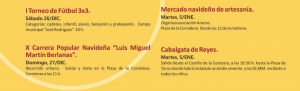 En lo que respecta al deporte, el club de atletismo organiza la X Carrera Popular Navideña “Luis Miguel Martín Berlanas” que recorrerá las calles del municipio el 27 de diciembre, el primer torneo de Fútbol 3X3 y una exhibición de gimnasia rítmica.
